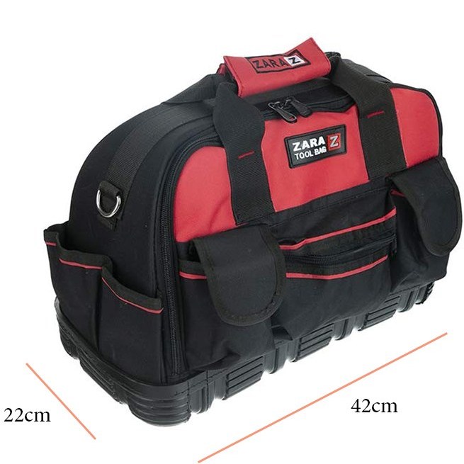 ابعاد استاندارد کیف ابزار زارا 121 Pro حدود ۴۵ × ۳۳ × ۲۵ سانتیمتر است؛ بنابراین فضای کافی برای ابزارهایی مانند آچار، پیچگوشتی، انبردست، متر، دریل و سایر تجهیزات فنی فراهم میکند. وجود دستههای مقاوم و بند دوشی قابلتنظیم، حمل این کیف را در محیطهای کارگاهی یا ساختمانی بسیار آسان میسازد.
